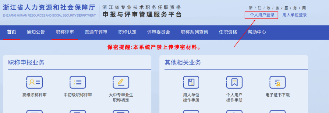 打开浏览器,输入:https://zcps.rlsbt.zj.gov.cn,点击【个人用户登录】,进入登录界面。输入个人政务服务网用户名和密码(或扫描二维码),登录浙江省专业技术职务任职资格申报与评审管理服务平台。